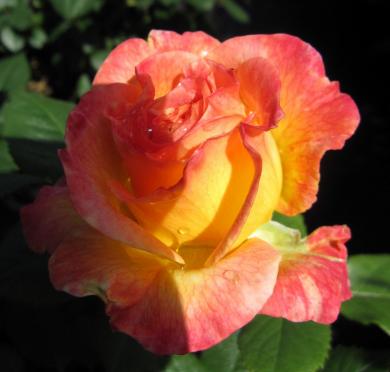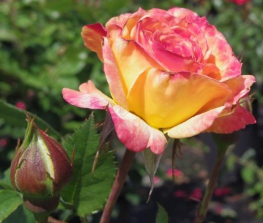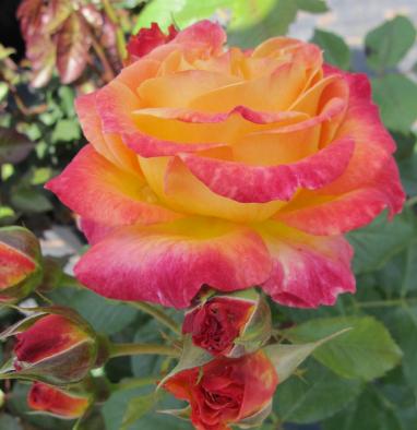 Blüte: schalenförmig, gefüllt, gelb mit orangem Farbverlauf und rotem Rand, öfterblühend, reichblühend